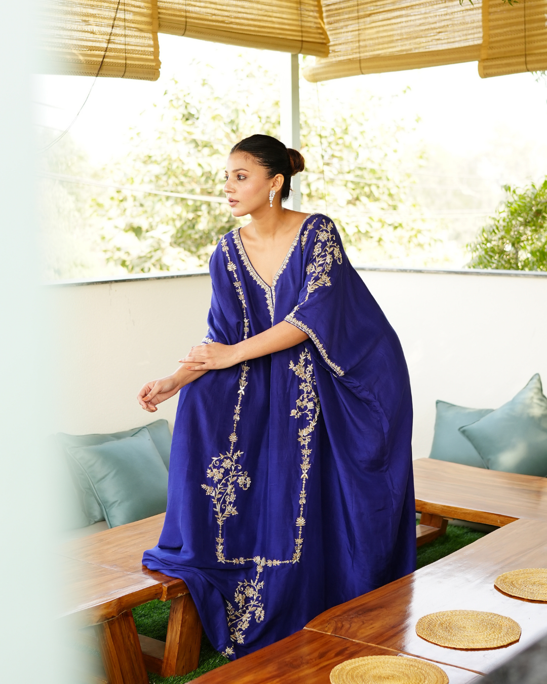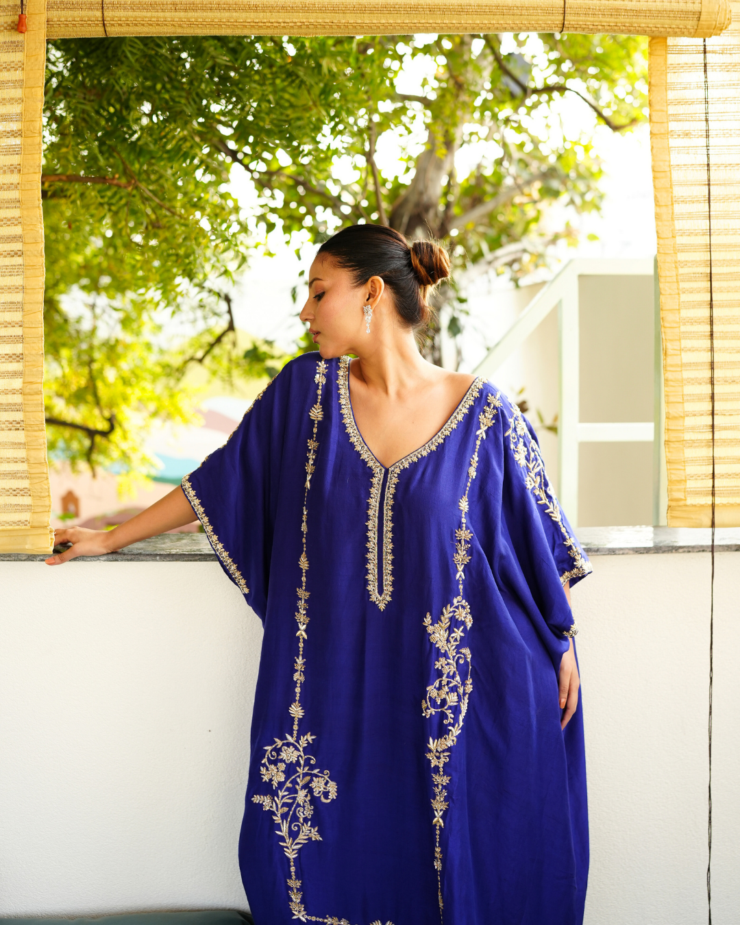 Unfold timeless sophistication with Gazal, a luxurious royal blue kaftan designed for women who appreciate effortless elegance.
